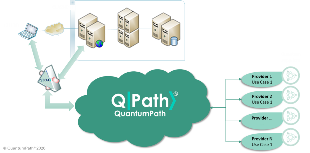 qSOA® es la solución por diseño de QuantumPath® para la creación de arquitecturas híbridas, a través de la cual se proporcional acceso a los servicios cuánticos de forma centralizada: un acceso vía red de comunicaciones, un protocolo de acceso a los servicios del nuevo sistema y la aplicación de las buenas prácticas en todos los niveles de acceso (seguridad, trazabilidad, gobernanza, …).